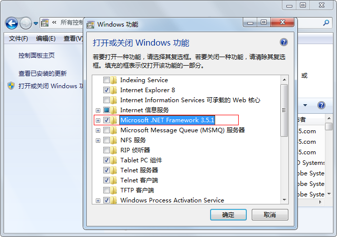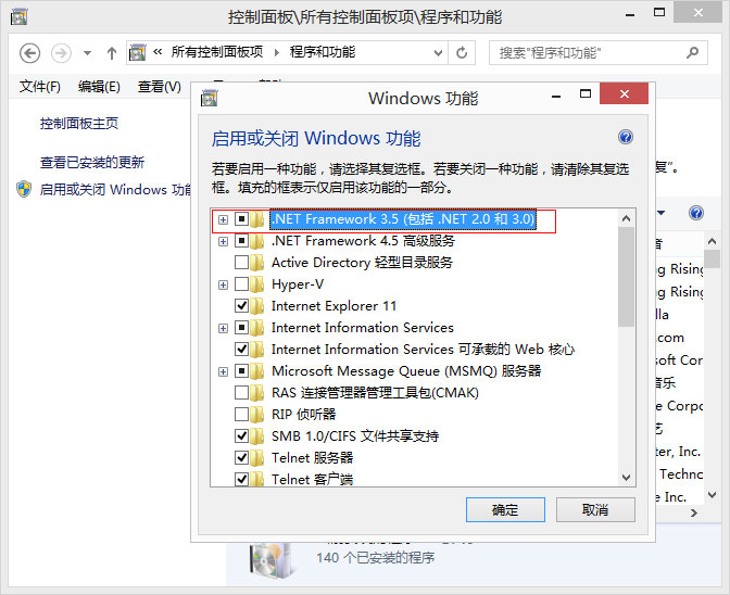然后在打開的“Windows功能”窗口中查看“.NET Framework 3.5(包括.NET 2.0和3.0)”,如果已經被選中,則證明已經安裝成功。如圖: