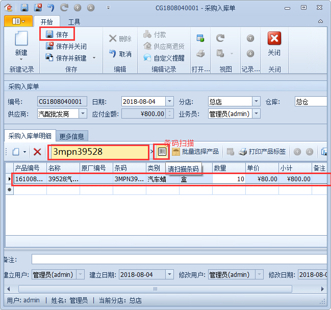 2、在采購(gòu)入庫(kù)單明細(xì)中根據(jù)到貨單,掃描或輸入商品條碼將產(chǎn)品入庫(kù),再將產(chǎn)品的數(shù)量填入系統(tǒng)中,保存即可。如圖: