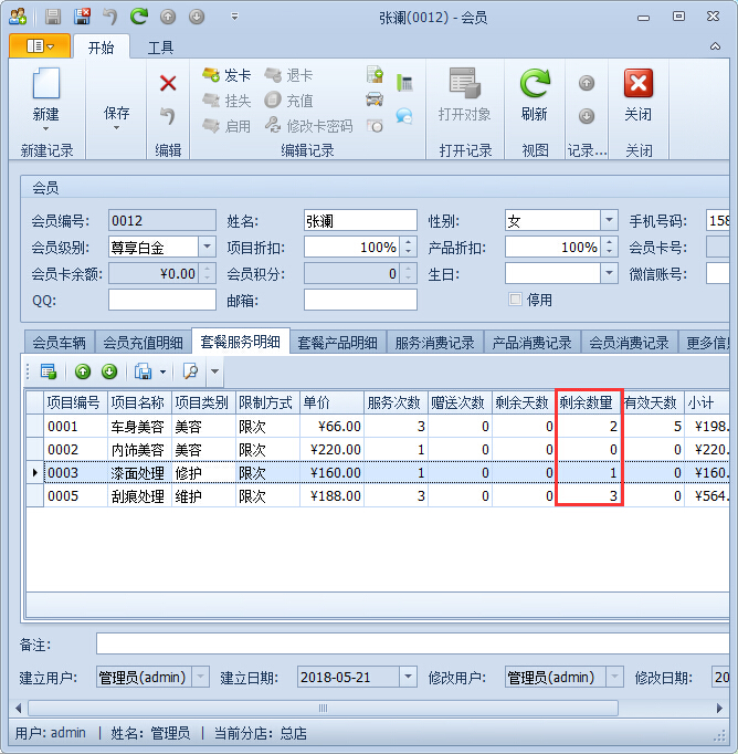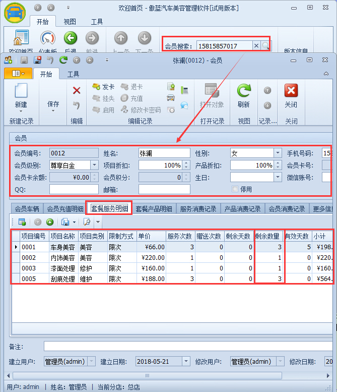 汽車美容店的會員到店消費已購買的套餐服務(wù),店員根據(jù)會員提供提供的電話號碼或姓名,在傲藍汽車美容軟件的搜索欄中快速搜索出會員資料,查看會員資料中剩余可以用的套餐服務(wù)次數(shù),如圖: