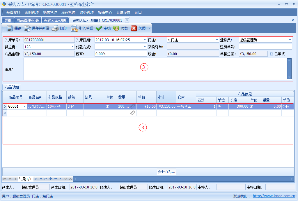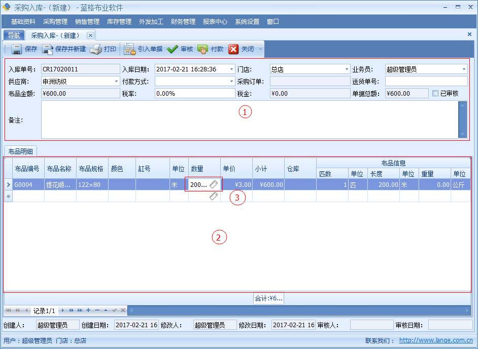 傲藍布行管理系統(tǒng),怎樣操作采購入庫單錄入布匹明細