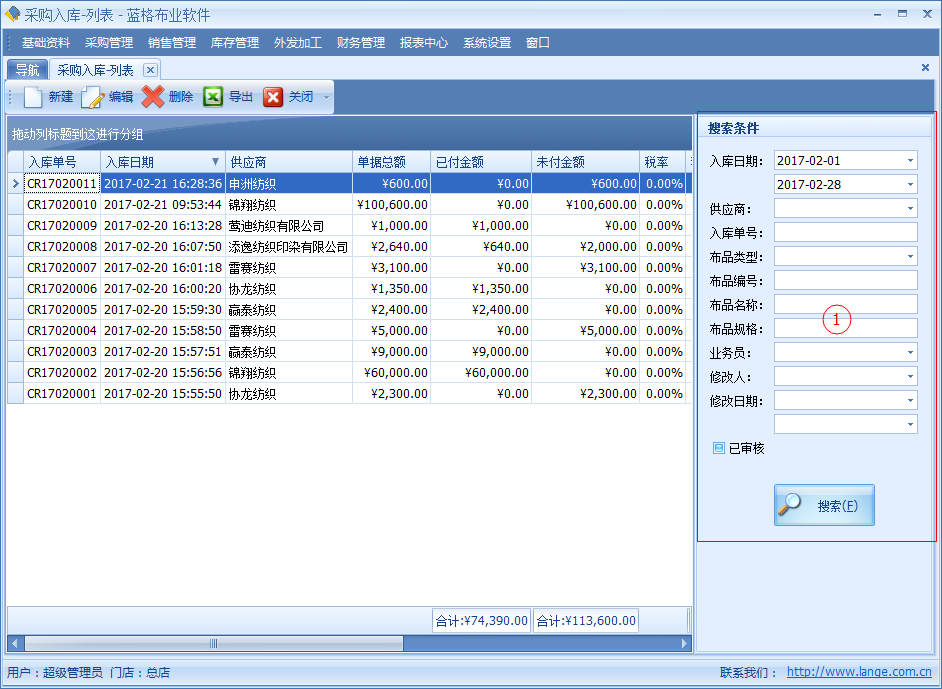 傲藍布行管理系統(tǒng),主要是對采購回來的布品,進行錄入入庫。【采購入庫】單具體中記錄了采購布匹的單據(jù)日期、引用采購單據(jù)編號、供應商、送貨單、入庫的倉庫、單據(jù)總金額、稅率、稅金等信息。明細列表中包括單據(jù)采購布品名稱,顏色,單位,數(shù)量價格等詳細數(shù)據(jù)。