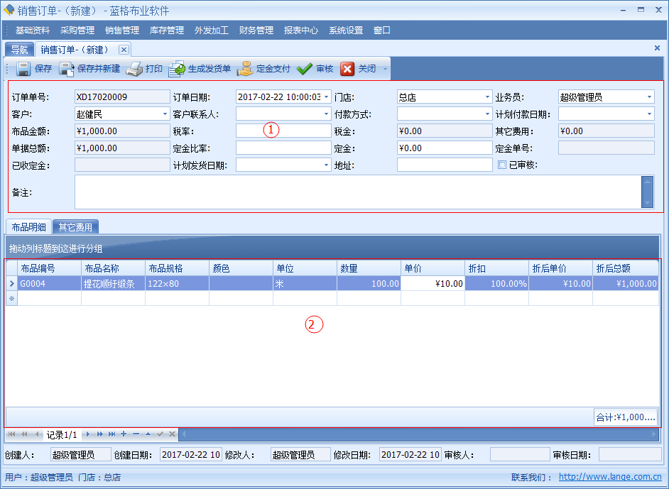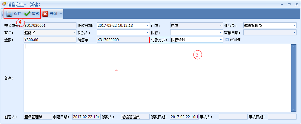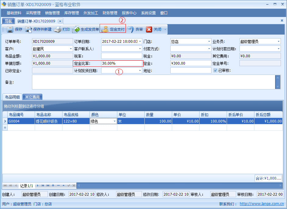 如需要為這張銷售訂單收取定金,在定金欄上填寫相應的定金金額或在定金比例欄上填寫相應的比例。具體操作步驟如下圖: