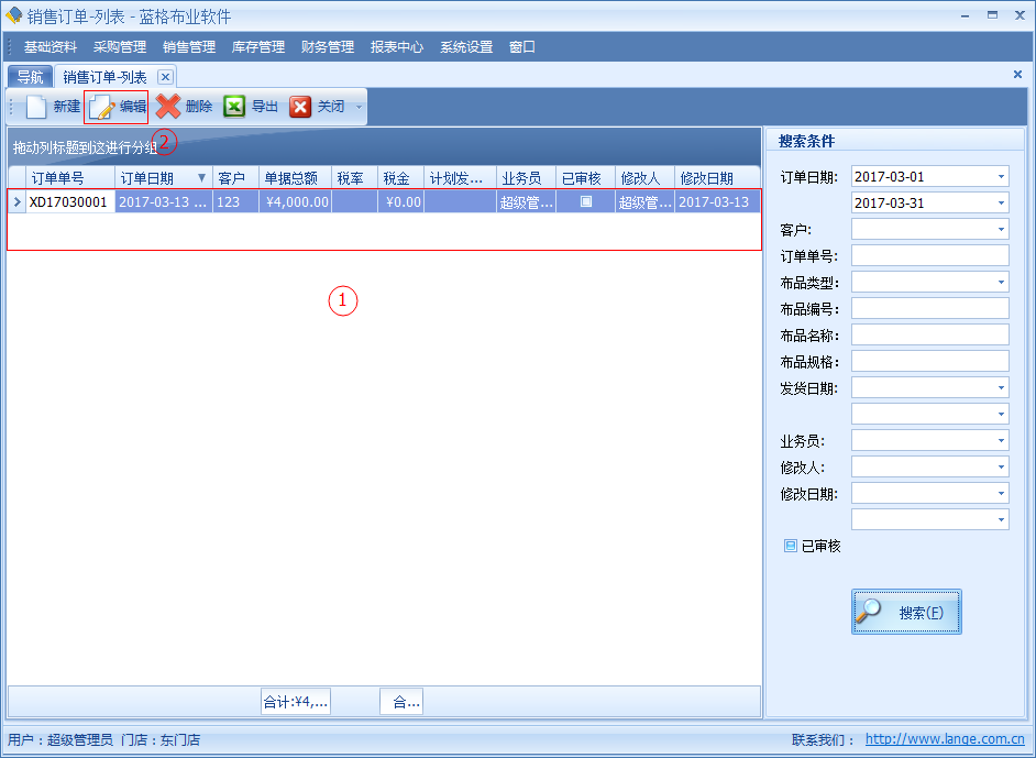 如需要對銷售訂單某一條數據進行修改的,通過銷售訂單列表選中一條記錄點擊【編輯】按鈕,進入