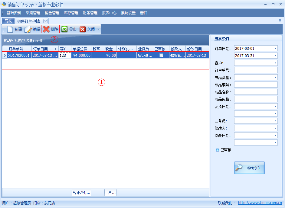 如需要對銷售訂單中某一條數據進行刪除的,通過銷售訂單列表選中一條記錄點擊【刪除】按鈕,刪