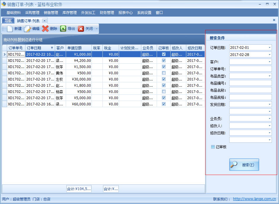 ○1 通過訂單編號或者客戶,布品名稱等方式查詢列表。 如下圖: