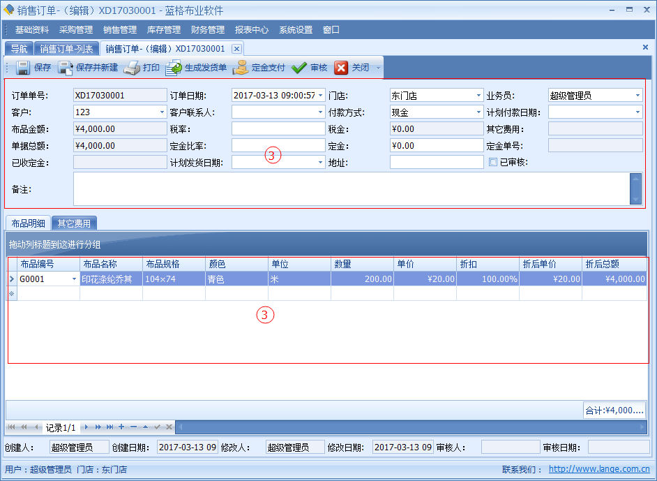 傲藍布料銷售軟件銷售訂單管理,銷售訂單主要是用于,銷售時按照客戶所需要的布品,進行登記。在銷售訂單中錄入銷售訂單,銷售訂單的信息包括開單日期、客戶、聯系人、付款方式、金額、定金、稅率、稅金等信息。明細數據中是該單據銷售布品名稱,顏色,單位,數量價格等詳細數據。