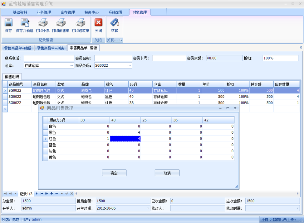 在上圖中點擊【新建】打開零售商品單據編輯界面。填寫好單據相關的信息。然后點擊【保存】這樣就把該零售商品錄入到傲藍鞋帽銷售管理系統中。當在上圖中選擇一個單據點擊【編輯】,在該界面中會顯示選擇單據的詳細信息,修改其中的項目,然后點擊【保存】,單據信息就更新完成。在商品條碼框中輸入商品條碼然后按回車鍵,系統會自動把該商品加入到銷售列表中,當該條碼對應多個商品時,會彈出商品選擇框,選擇詳細的商品。如下圖所示: