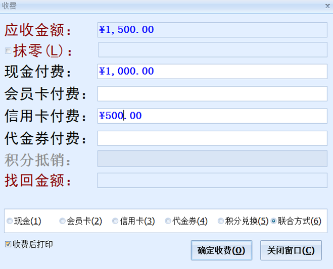 上圖數據保存好后,點擊【結算】,傲藍鞋帽銷售管理系統會彈出結算窗口,點擊【確定收費】結算成功,點擊【關閉窗口】取消收費。如下圖所示: