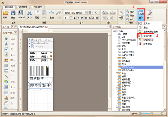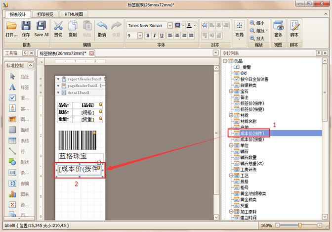 如果新增一個打印數據,可以在界面右側的【字段列表】中1選擇相應字段按住鼠標左鍵,2拖出相應的字段到編輯區即可。如圖中要顯示【成本價(按件)】,1選擇拖動,2拖動入編輯區中入。