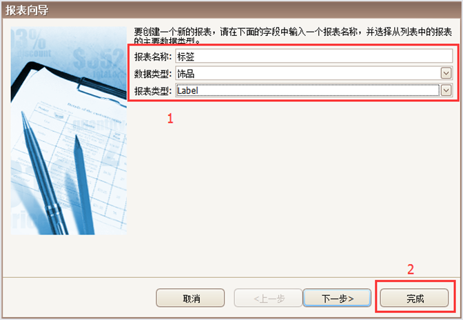 彈出【報表向導】,1在向導中【報表名稱】可以隨意填寫,【數據類型】選擇【飾品】,【報表類型】選擇【Label】,2選擇完后可以點擊【完成】。