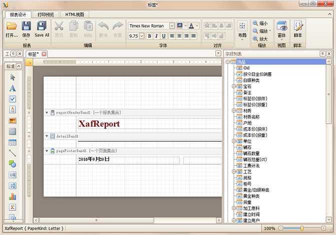 傲藍珠寶銷售管理軟件內嵌一個強大的報表設計功能,點擊【報表中心】--【報表設計】,軟件的左側出現很多現成的報表,顯示出來的所有報表都可以自定義設計。珠寶銷售管理軟件的常用標簽設計工具介紹