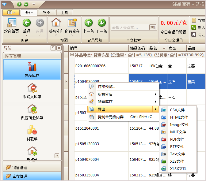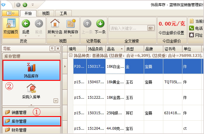 登錄到傲藍珠寶管理軟件,【庫存管理】——【飾品庫存】,主界面如下圖所示: