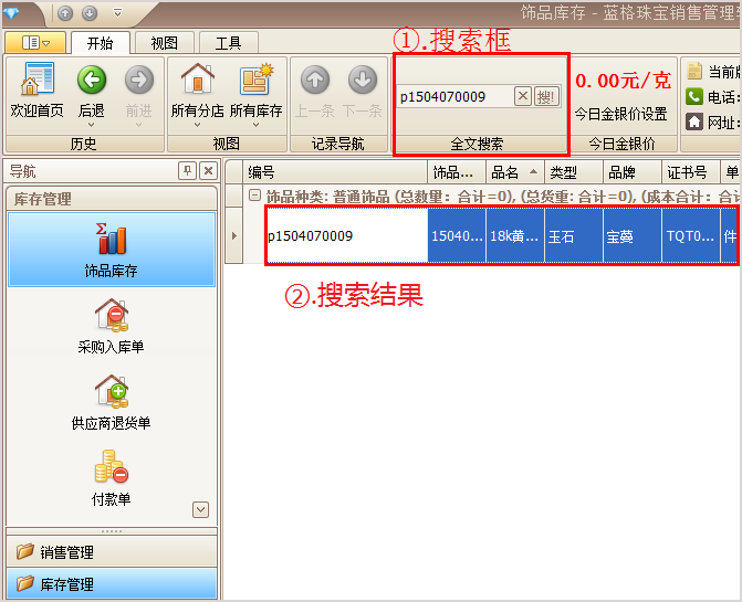 飾品庫存支持【全文搜索功能】,通過【條碼掃描】查找該飾品的庫存通過以下方式,在【全文搜索框】處掃描條碼或輸入關鍵字可以搜索出相關的內容,結果顯示搜索的飾品記錄,如下圖所示: