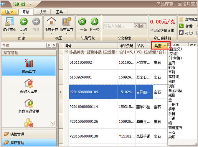 飾品庫存中支持字段的【篩選】,如下圖所示點擊字段后的“珠寶篩選功能”篩選指定的飾品: