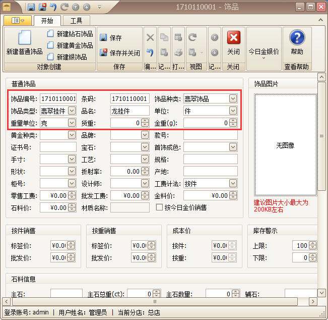 2、普通飾品新建,點擊“新建普通飾品”進入飾品基礎資料錄入界面,軟件支持飾品條碼管理,新建飾品時,軟件自動生成飾品條碼,有修改飾品條碼的必要時,可以在條碼中修改即可;軟件支持按飾品種類和類型對飾品進行管理,實現更加精準的商品統計和飾品盤點;軟件飾品資料內容齊全完全符合行業需求,輸入飾品的品名、單位、重量等必填的項目,即可保存商品,如圖: