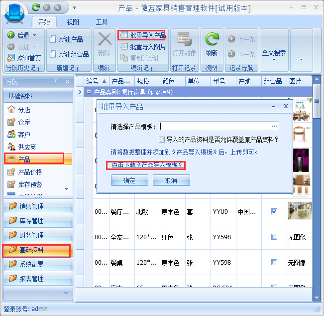 ⑤導(dǎo)入完成之后,傲藍家具店鋪收銀系統(tǒng)就會在產(chǎn)品資料中新增導(dǎo)入的產(chǎn)品,如圖: