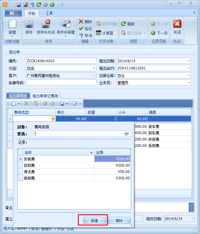 選擇費(fèi)用類型前可先建立【費(fèi)用類型】,可以通過(guò)點(diǎn)擊下拉菜單新建,新建租賃站的其它費(fèi)用類型,進(jìn)行編輯管理,如下圖