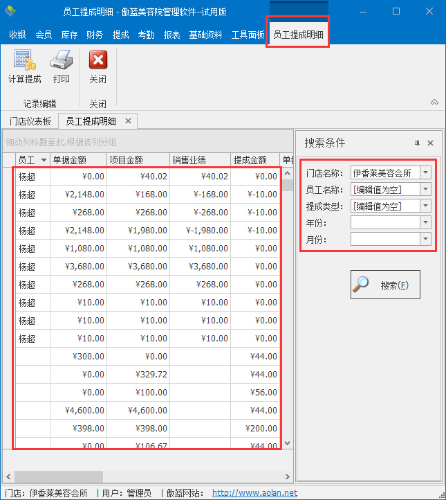 點擊【提成管理】→【提成明細】即可讀取店鋪中每一位員工的提成明細