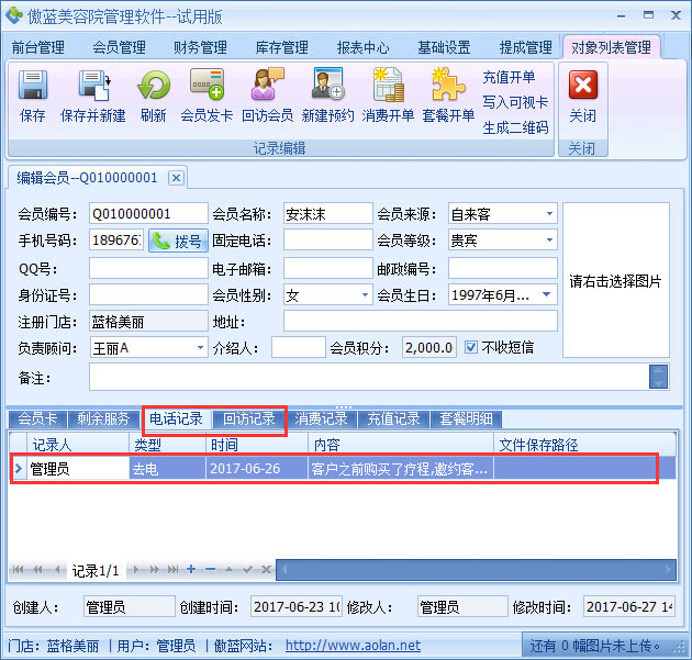 ③電話記錄和回訪記錄掌握店員對會員的跟進情況,如圖: