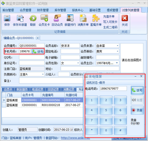 ⑤傲藍美容院會員管理軟件還支持直接在軟件上進行撥號,點擊手機號碼后的“撥號按鈕”即可電話給會員進行回訪,如圖: