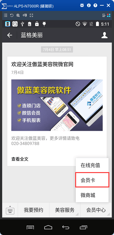 傲藍美容院微信會員系統結合美容院公眾號的前臺具體的操作步驟如下: