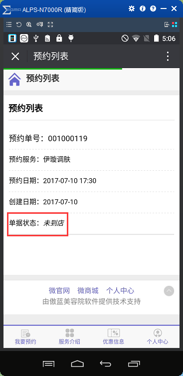 ②會員在微信公眾號預約之后,美容院的工作人員可在門店的傲藍美容院微信會員系統中根據預約提醒,進入預約列表,根據會員在預約單進行合理的工作安排,如圖: