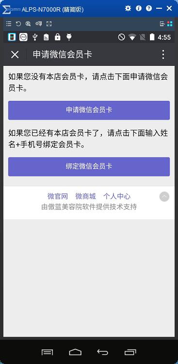 ②若該會員已經是本店的會員卡點擊“綁定微信會員卡”即可,若微信用戶還不是美容院的會員則點擊“申請微信會員卡”如圖:
