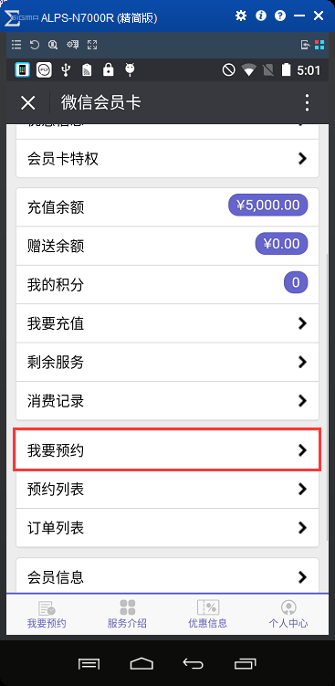 3、傲藍美容院微信會員系統微信公眾號預約功能,會員可在美容院微信公眾號的【會員中心】→【會員卡】界面進行服務預約,選擇“我要預約”或者在微信公眾號的首頁,點擊【我要預約】如圖: