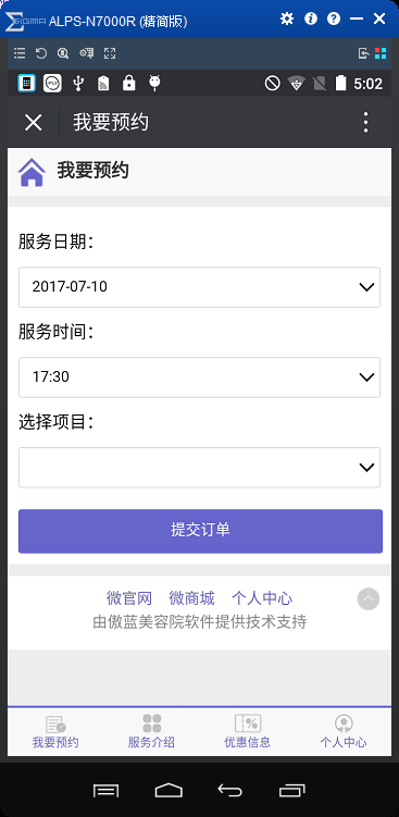 ①進入微信預約界面,填寫預約服務的具體時間,服務的項目,點擊“提交訂單”即可提交預約單,如圖:
