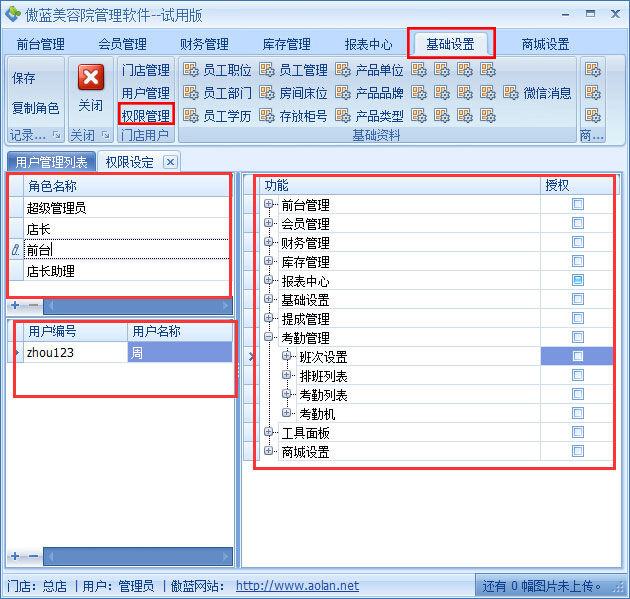 2、登錄軟件的用戶創建完成之后,在【基礎設置】→【權限管理】中根據角色,賦予該員工使用軟件的具體權限。左上角的角色名稱表示,該美容院使用傲藍美容院管理軟件的角色群體劃分;左下角的用戶編號,表示某個角色模塊包含哪些用戶,這些用戶就具有該角色的全部權限;右邊窗口表示不同功能模塊的權限管理。如圖: