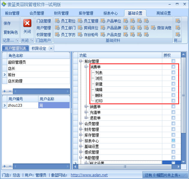 傲藍美容院管理軟件角色權限設置保障數據安全