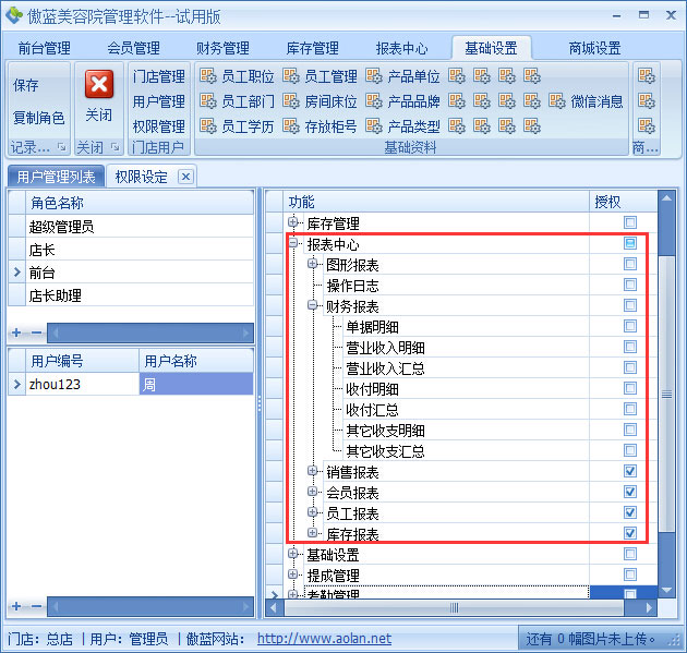 4、美容院的財務報表屬于美容院的敏感數據,為了確保信息不外露,在傲藍美容院管理軟件中設置用戶權限時需要更加嚴謹、慎重,根據員工職位授予相應的權限即可,如圖: