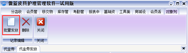 2、①代金券建立完成,在【會(huì)員活動(dòng)】中點(diǎn)擊【代金券發(fā)放】將代金券發(fā)放給會(huì)員,點(diǎn)擊“批量發(fā)放”,如圖: