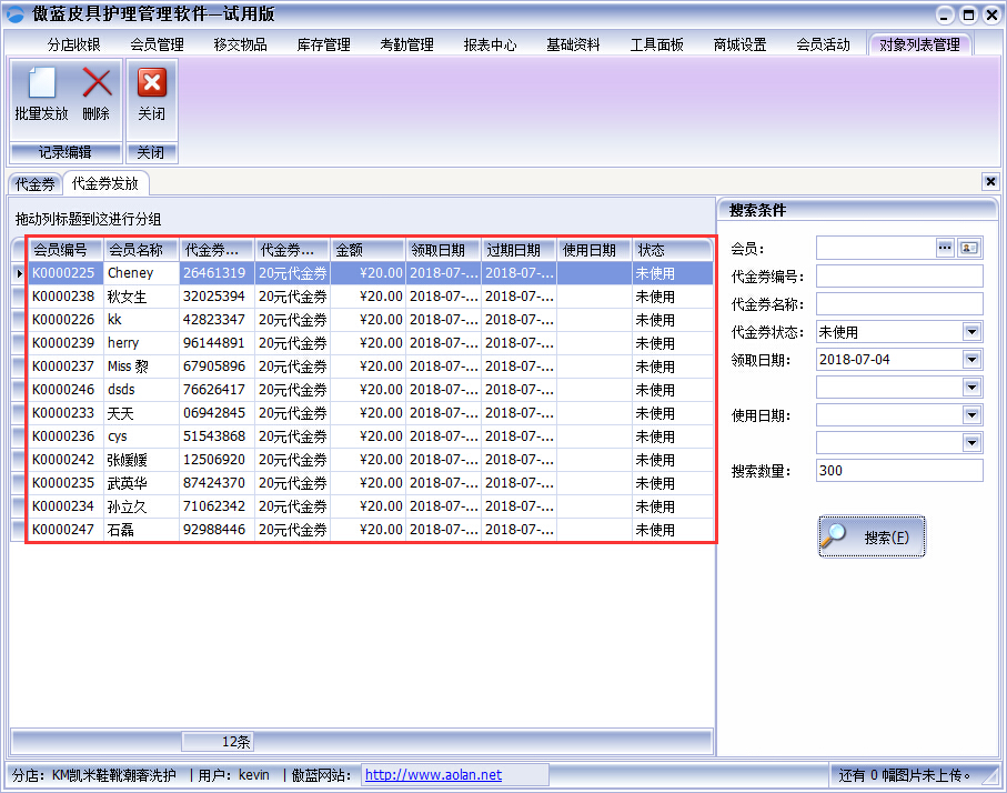 ②在代金券發(fā)放界面,選擇需要發(fā)放的代金券,再批量選擇需要發(fā)放的會(huì)員(會(huì)員列表,按住shift鍵鼠標(biāo)左鍵點(diǎn)擊可多選),會(huì)員選擇完成,保存,如圖: