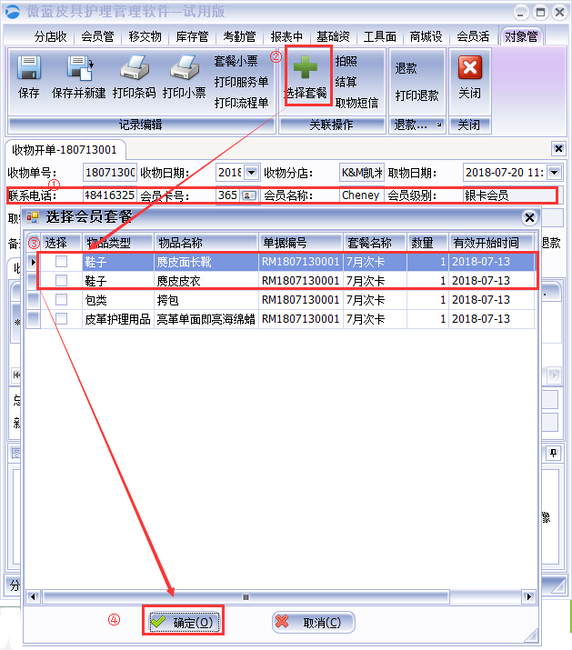 店員在傲藍皮具護理店收銀軟件給會員開單消費的具體操作步驟: