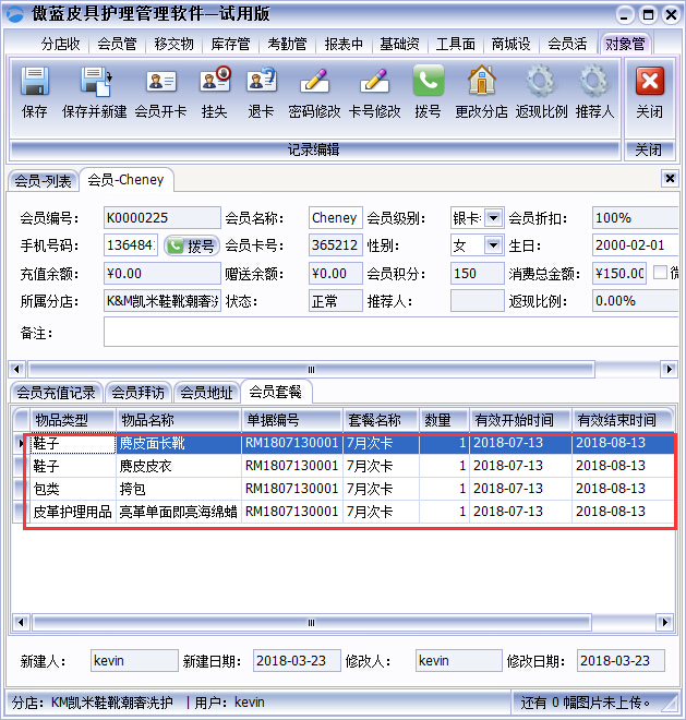 2、會員購買的套餐有所消耗之后,需要查詢會員剩余的套餐數(shù)量,可以在傲藍皮具護理店管理系統(tǒng)中的會員詳細信息中【會員套餐】中進行查看,如圖: