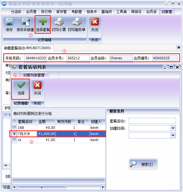 2、套餐首次銷售操作:傲藍皮具護理店管理系統套餐活動基礎設置完成后,就可以在軟件中進行套餐銷售開單了,點擊【會員管理】→找到【銷售套餐】可以為會員或散客建立套餐開單,填入會員或散客的信息,點擊菜單欄上的“選擇套餐”選擇客戶購買的套餐,點擊“選擇”即可,如圖: