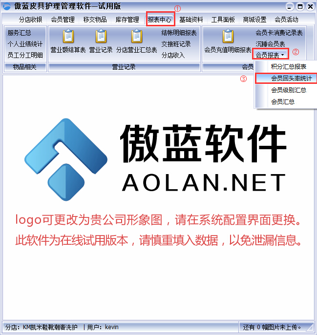 傲藍(lán)皮革養(yǎng)護(hù)店軟件中,會員回頭率統(tǒng)計報表非常實用,能及時統(tǒng)計會員回頭消費(fèi)的情況,如何在傲藍(lán)皮具修理中心管理軟件查看?如下為您介紹。