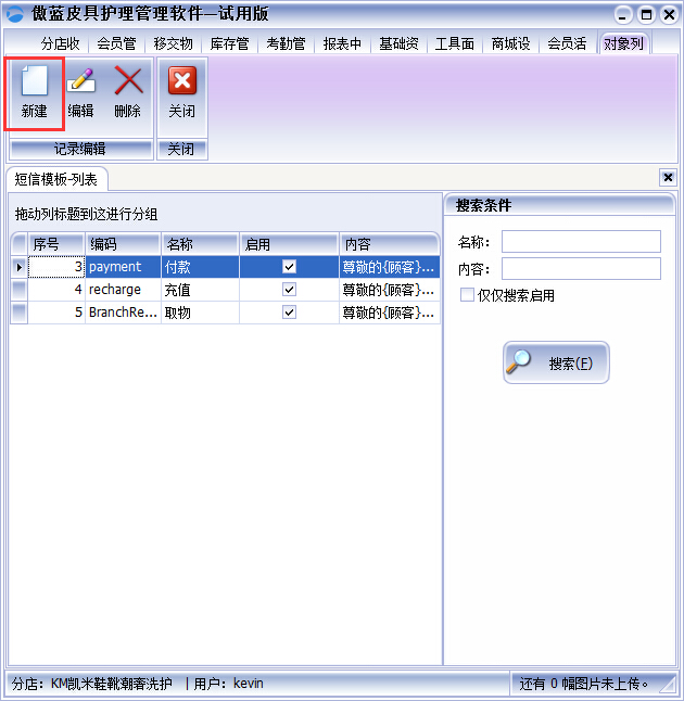 1、點(diǎn)擊【基礎(chǔ)資料】【短信模板】就會彈出【新建】的界面,如圖:
