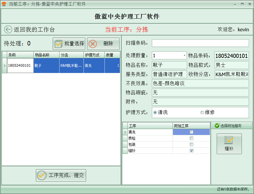 傲藍(lán)皮具護(hù)理工廠管理軟件專(zhuān)為護(hù)理工廠設(shè)計(jì),分揀、清洗、護(hù)理、維修、質(zhì)檢、包裝、縫補(bǔ)、等業(yè)務(wù),還可以根據(jù)業(yè)務(wù)自定義工序,與護(hù)理門(mén)店軟件完美結(jié)合。
