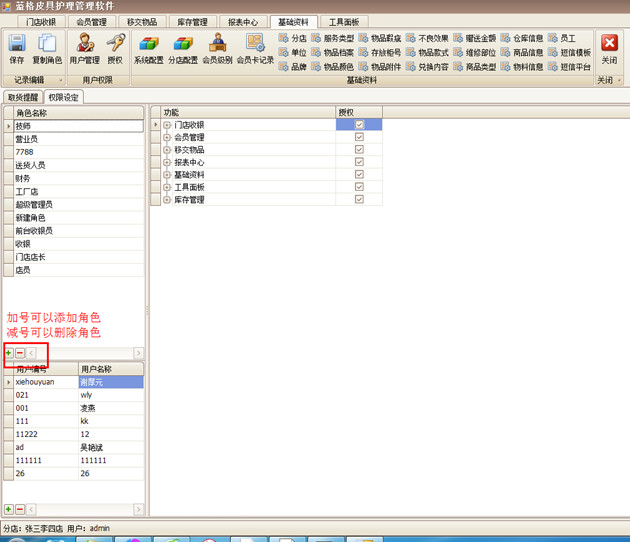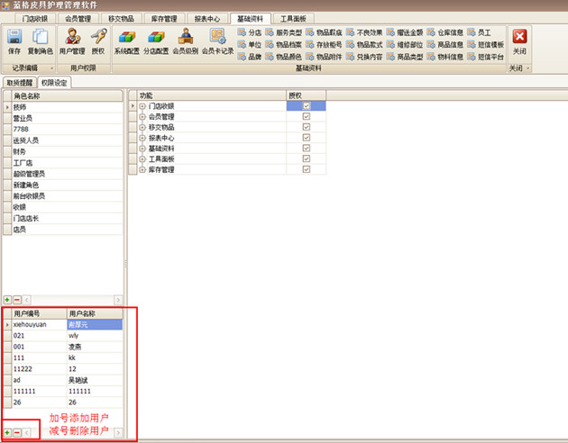 角色添加完畢,點(diǎn)擊保存就可以了。重新啟動(dòng)程序,用新建的用戶賬號(hào)密碼登錄,就能開(kāi)始工作了。傲藍(lán)皮具護(hù)理管理軟件祝您事事順心,工作開(kāi)心。