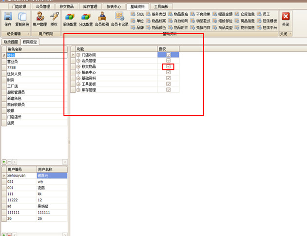 角色添加好后就能給相應(yīng)的角色設(shè)置權(quán)限,讓每個(gè)角色只操作自己相應(yīng)的系統(tǒng)功能。選中角色,在右邊的對(duì)話框的授權(quán)里打鉤,角色就能操作相應(yīng)的系統(tǒng)功能,如下圖所示:
