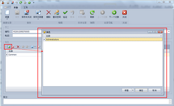第3步、點擊“角色”選項卡的“鏈接”按鈕,在彈出的角色列表選擇界面中選擇需要分配給該員工的角色,則該員工就擁有該角色的所有權限。