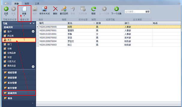 第1步、登錄傲藍汽車維修管理系統,點擊“基礎資料”-“員工”,出現員工列表界面。