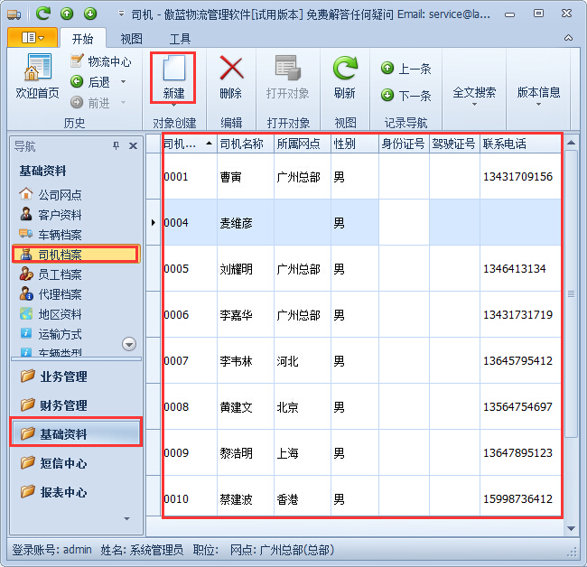 通過傲藍物流軟件司機檔案功能可以管理司機身份證號、駕駛證號、所屬網點、聯系電話、聯系地址、相片等信息。下面我們來介紹一下為網點添加司機的過程