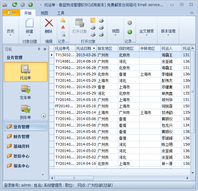業務量比較大的時候,單成堆,找數據變得麻煩了,怎樣能夠快速找到我想要的單呢?通過傲藍物流管理軟件的篩選和全文搜索功能,你可以輕松辦到這一點,例如一位叫“黃穎怡”的客戶打電話過來問“我想查一下我5月6號單號為TY201405160006的單到貨沒有?”,因為運輸要幾天時間,而且網點這幾天也接到不少單,因此這個單子不容易從列表中看出來。