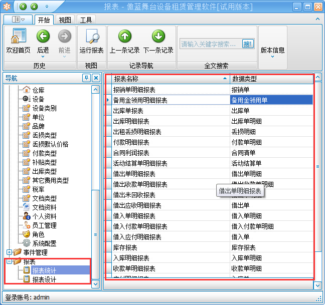 傲藍舞臺租賃軟件應用-報表中心的介紹,豐富報表滿足多種舞臺設備租賃用途的查詢、打印、統計以及圖表反應數據。具體報表包括:報價單報表、出租丟損單報表、出租丟損明細報表、出租合約報表、出租合約報表(按客戶)、出租回收單報表、出租設備清單、付款單報表、付款明細報表、活動出庫單報表、活動暫支結算單報表、結算單報表、庫存報表、收費單報表、收費明細報表、應付報表、應收報表。