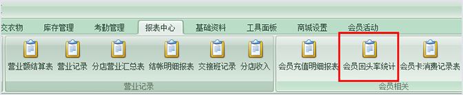 1、點擊打開軟件,在上欄導航中選擇【報表中心】,快速跳轉到報表中心界面,跳到【報表中心】界面后,在中部導航欄點擊打開【會員回頭率統(tǒng)計報表】表上,如下圖: