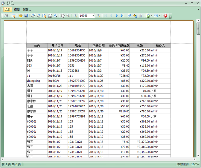 3、在洗衣店會員管理軟件中會員消費報表中點擊上面的打印,就可以查看該報表的打印預覽,非常的方便 ,如圖: