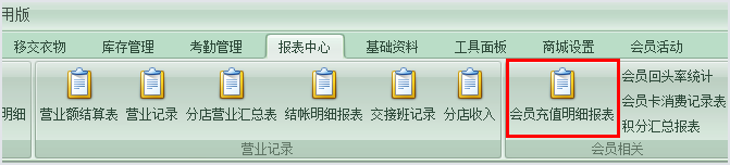 1、進(jìn)入干洗店會(huì)員管理軟件點(diǎn)擊“報(bào)表中心”的會(huì)員充值明細(xì)報(bào)表。
